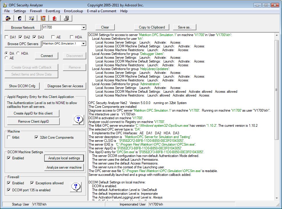 The OpcSecurityAnalyzer utility is a Windows Forms application designed to help with security permission settings related to OPC DA server access in order to: